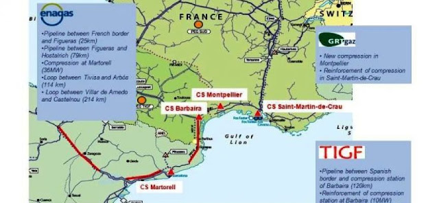 “Será construído um gasoduto estratégico que atravessará os Pirineus Catalães, ligando a Península Ibérica com França e Europa Central. O projeto Midcat visa a reduzir o muito que a Europa depende do gás russo em 40%, diversificando a fonte de suprimento. O gasoduto deve estar operante em 2020.”